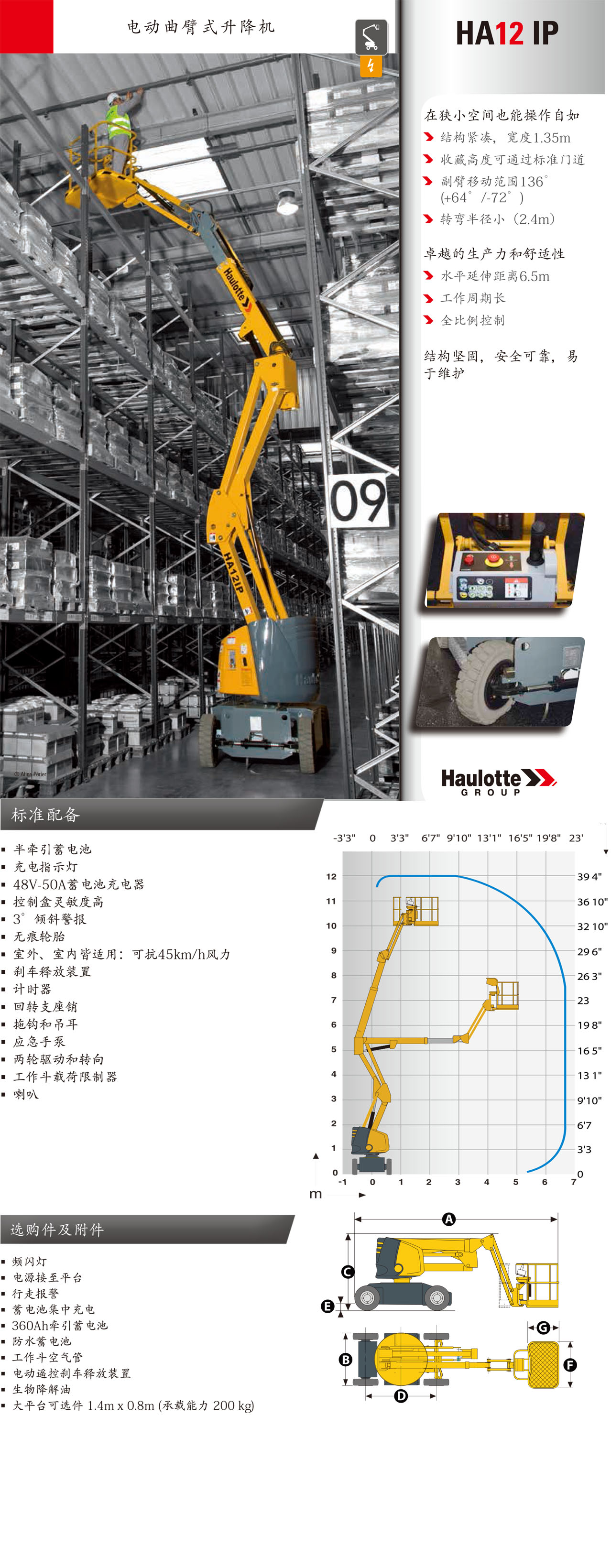 》電動(dòng)曲臂式升降機(jī),結(jié)構(gòu)緊湊,寬度1.35m,在狹小空間也能操作自如