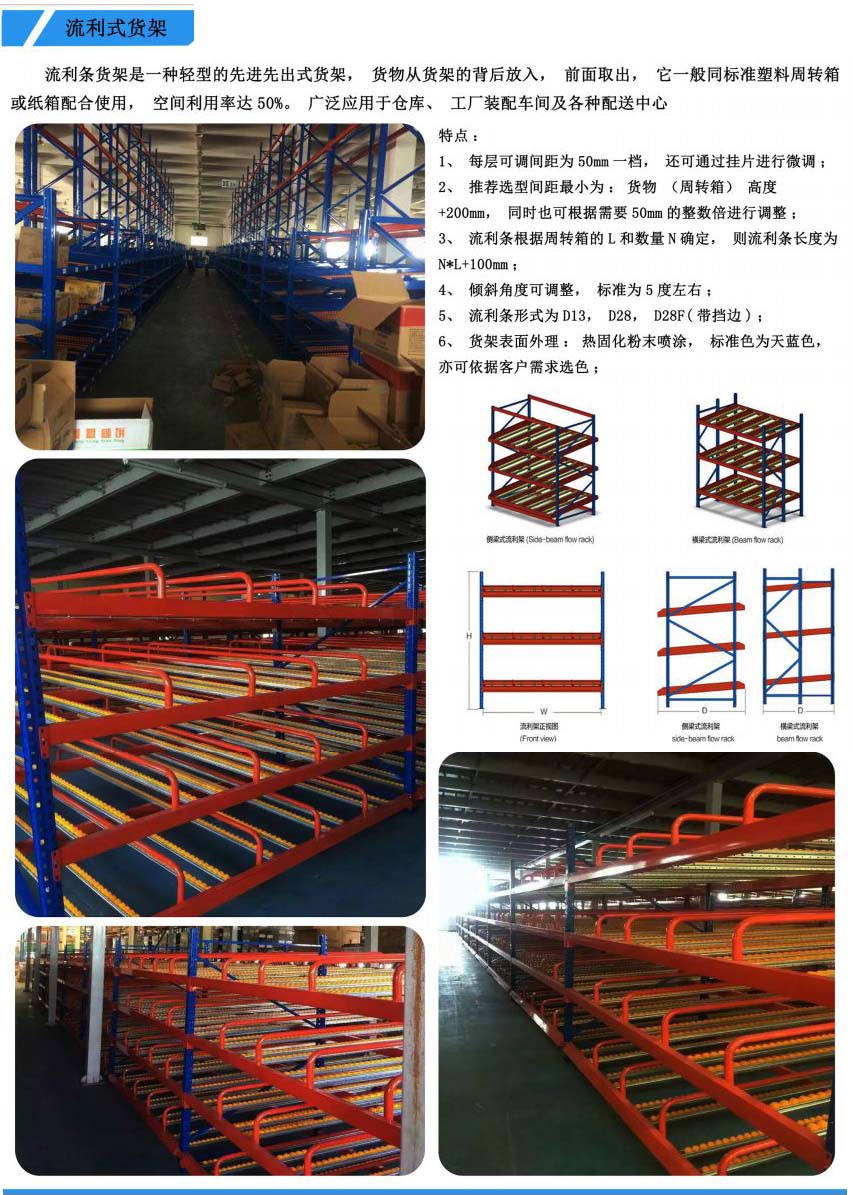 流利條貨架是一種輕型的先進(jìn)先出式貨架,貨物從貨架的背后放入,前面取出,它一般同標(biāo)準(zhǔn)塑料周轉(zhuǎn)箱或紙箱配合使用,空間利用率達(dá)50%。廣泛應(yīng)用于倉(cāng)庫(kù)、工廠裝配車間及各種配送中心。